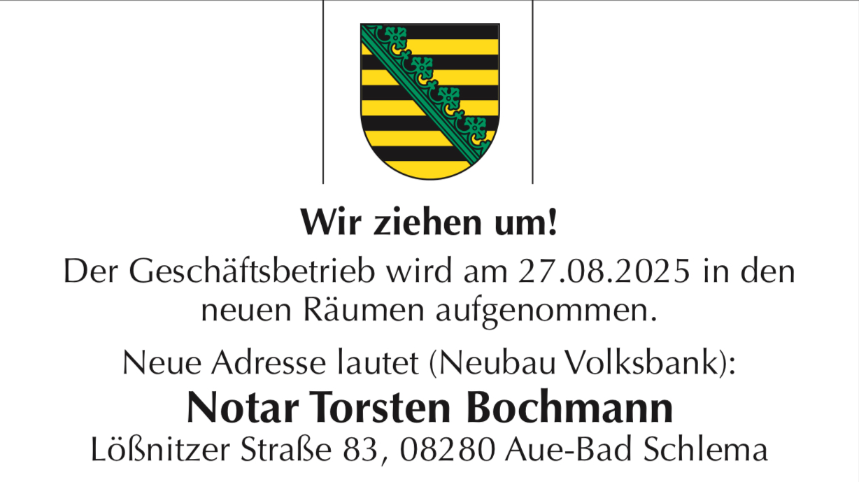 WIR SIND UMGEZOGEN !!! Mit bewährtem Team sind wir ab dem 27.08.2025 im neuen Büro für Sie da ! Die neue Adresse im Neubau der Volksbank am Erzgebirgsstadion lautet: Notar Torsten Bochmann Lößnitzer Straße 83,...   mehr